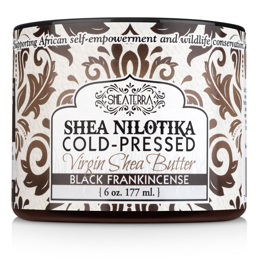 Contains only: 100% pure, USDA-certified organic, cold-pressed, virgin Shea Nilotik’ Shea Butter, black frankincense essential oil.